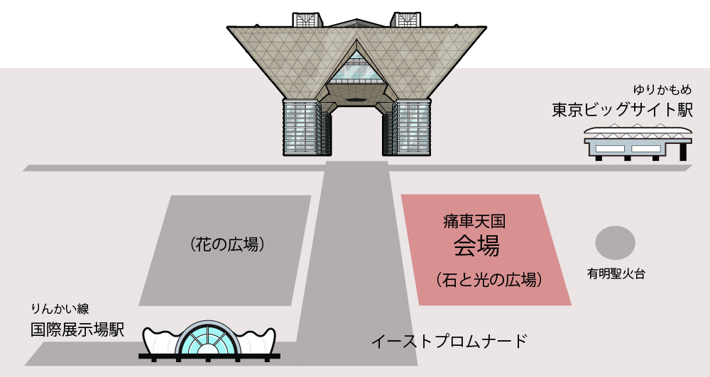 ビッグサイトへ続くイーストプロムナードの「石と光の広場」で痛車の熱を伝えよう!
